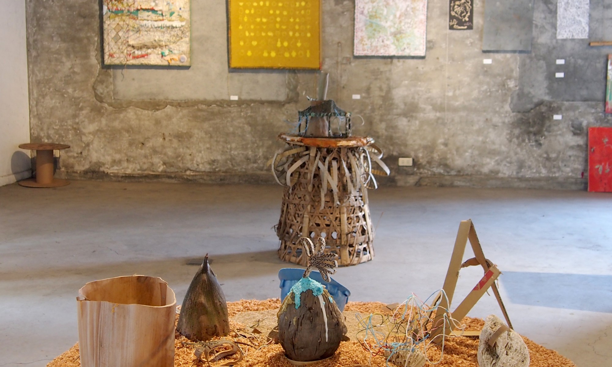 Water places, joss paper, coconut palm bark, wool, bamboo baskets, stuff from the seaside after the typhoon... 50x50x105 cm / 45x45x164 cm K.A.T. artist in residence program, Kaohsiung, Taiwan, 2014.