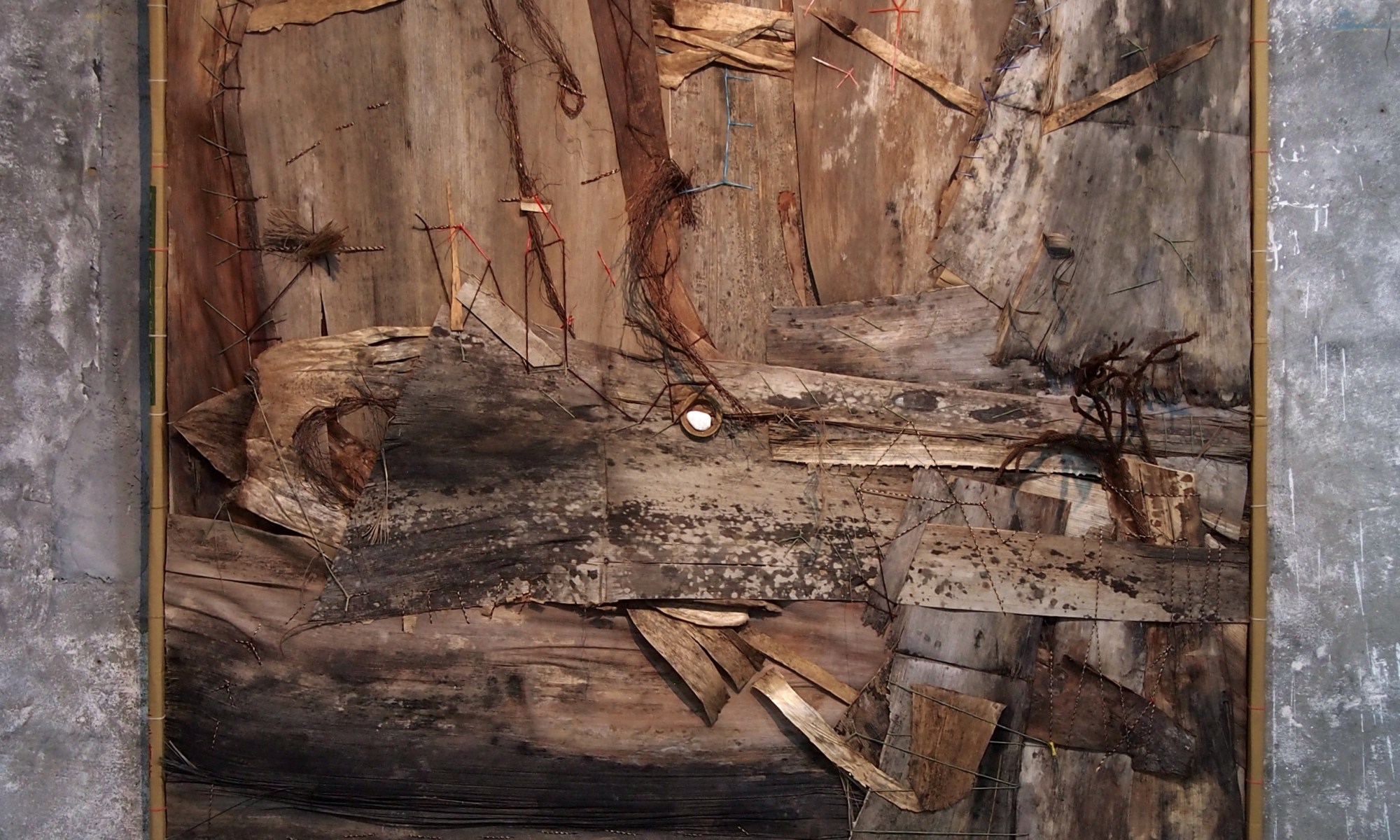 To travel by wood, coconut palm bark and other vegetal pieces on mosquito net, 160x172 cm K.A.T. artist in residence program, Kaohsiung, Taiwan, 2014.