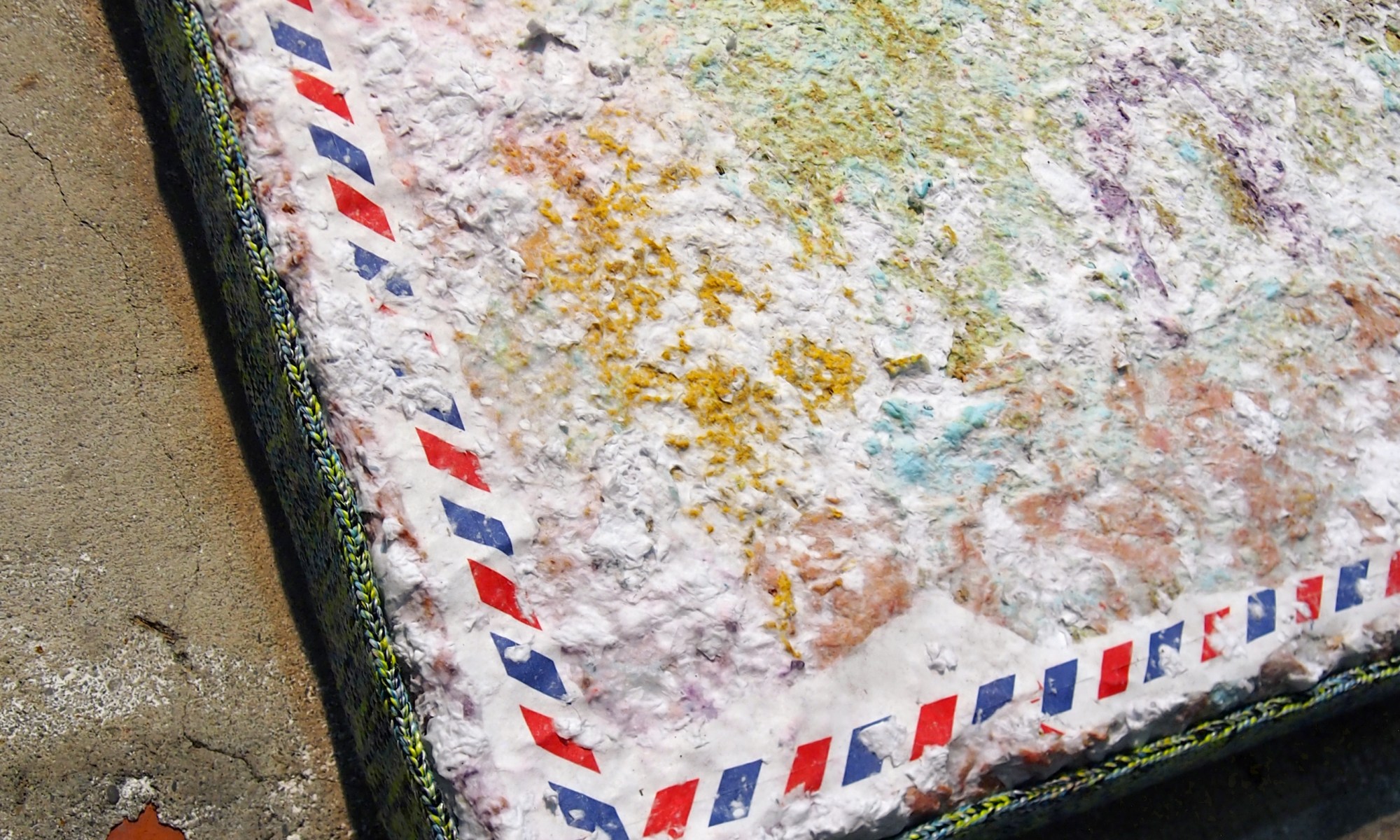 River of prayers, newspaper and joss paper on mosquito net K.A.T. artist in residence program, Kaohsiung, Taiwan, 2014.